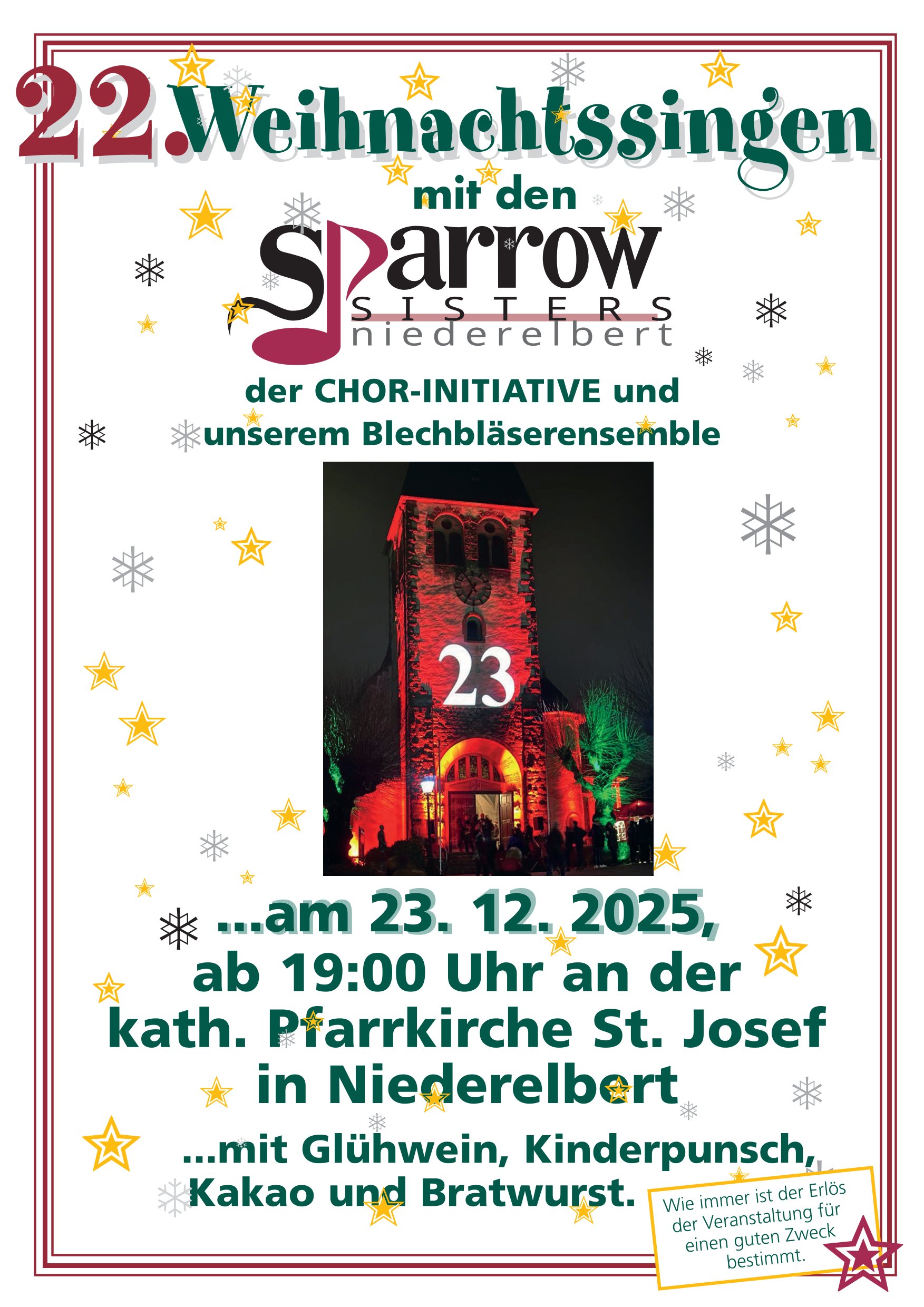 22. Weihnachtssingen mit den Sparrow Sisters 22. Weihnachtssingen mit den Sparrow Sisters + Zu Google Kalender hinzufügen + iCal / Outlook exportieren 00 Tage 00 Stunden 00 Minuten 00 Sekunden Datum 23 Dez. 2025 Uhrzeit 19:00 Labels Niederelbert Standort Kath. Pfarrkirche St. Josef, Niederelbert Kirchstr., Niederelbert Kategorie Musik / Konzerte Teile diese Veranstaltung