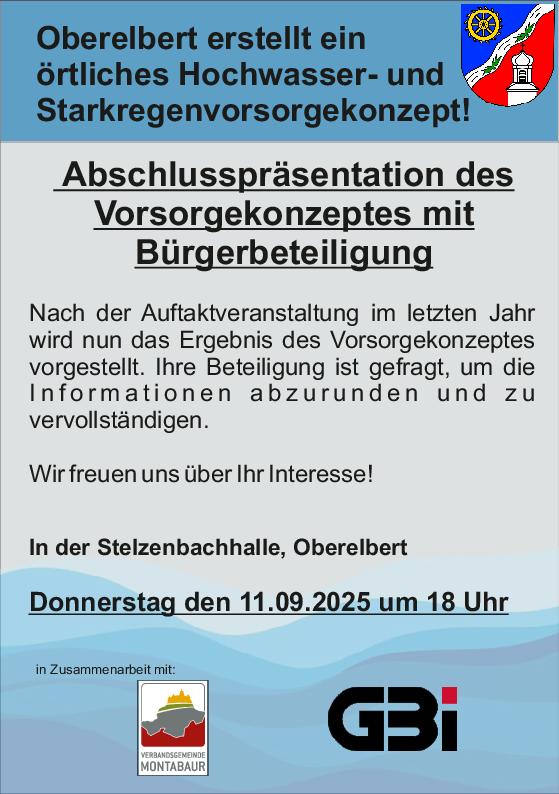 Abschlusspräsentation Hochwasser- und Starkregenkonzept Oberelbert Stelzenbachhalle + Zu Google Kalender hinzufügen + iCal / Outlook exportieren Die Veranstaltung ist beendet. Datum 11 Sep. 2025 Abgelaufen! Uhrzeit 18:00 Labels Oberelbert Standort Oberelbert Kategorie Wissen / Vortrag Teile diese Veranstaltung