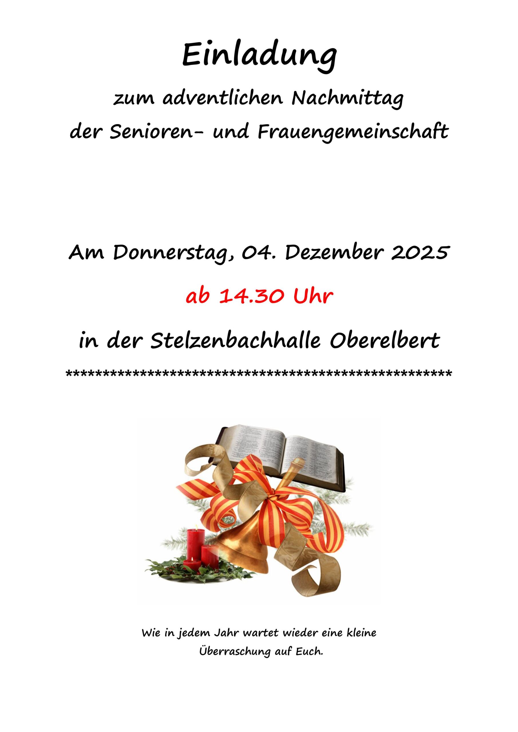 Adventlicher Nachmittag der Frauen- und Seniorengemeinschaft Oberelbert Stelzenbachhalle + Zu Google Kalender hinzufügen + iCal / Outlook exportieren Die Veranstaltung ist beendet. Datum 04 Dez. 2025 Abgelaufen! Uhrzeit 14:30 Labels Oberelbert Standort Oberelbert Kategorie Essen / Genuss Feste / Brauchtum Teile diese Veranstaltung