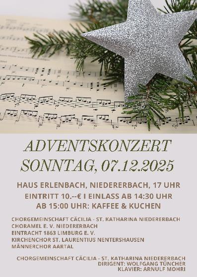 Die Chorgemeinschaft Cäcilia – St. Katharina Niedererbach „sagt an den lieben Advent“ und veranstaltet am Sonntag, dem 07. Dezember 2025 (2. Advent), im Haus Erlenbach, Mittelstr. 2-4, 56412 Niedererbach, ab 17:00 Uhr ihr Adventskonzert. Einlass ist bereits ab 14:30 Uhr, ab 15:00 Uhr ist die Caféteria mit selbstgebackenem Kuchen und Kaffee geöffnet. Der Eintritt beträgt 10.–€. Eintrittskarten können im Kartenvorverkauf ab Dienstag, dem 18.11.2025, bei der Bäckerei Schönberger (Niedererbach), bei allen Sängerinnen und Sängern und am Veranstaltungstag an der Kasse erworben werden.