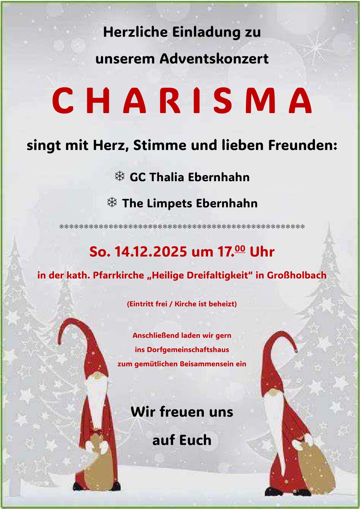 Der Frauenkirchenchor Charisma lädt zum vorweihnachtlichen Adventskonzert in die Kirche Großholbach ein. Als Gäste sind dabei, Gemischter Chor Thalia Ebernhahn und das Duo “The Limpits”. Man darf sich auf ein abwechslungsreiches und interessantes Programm freuen.