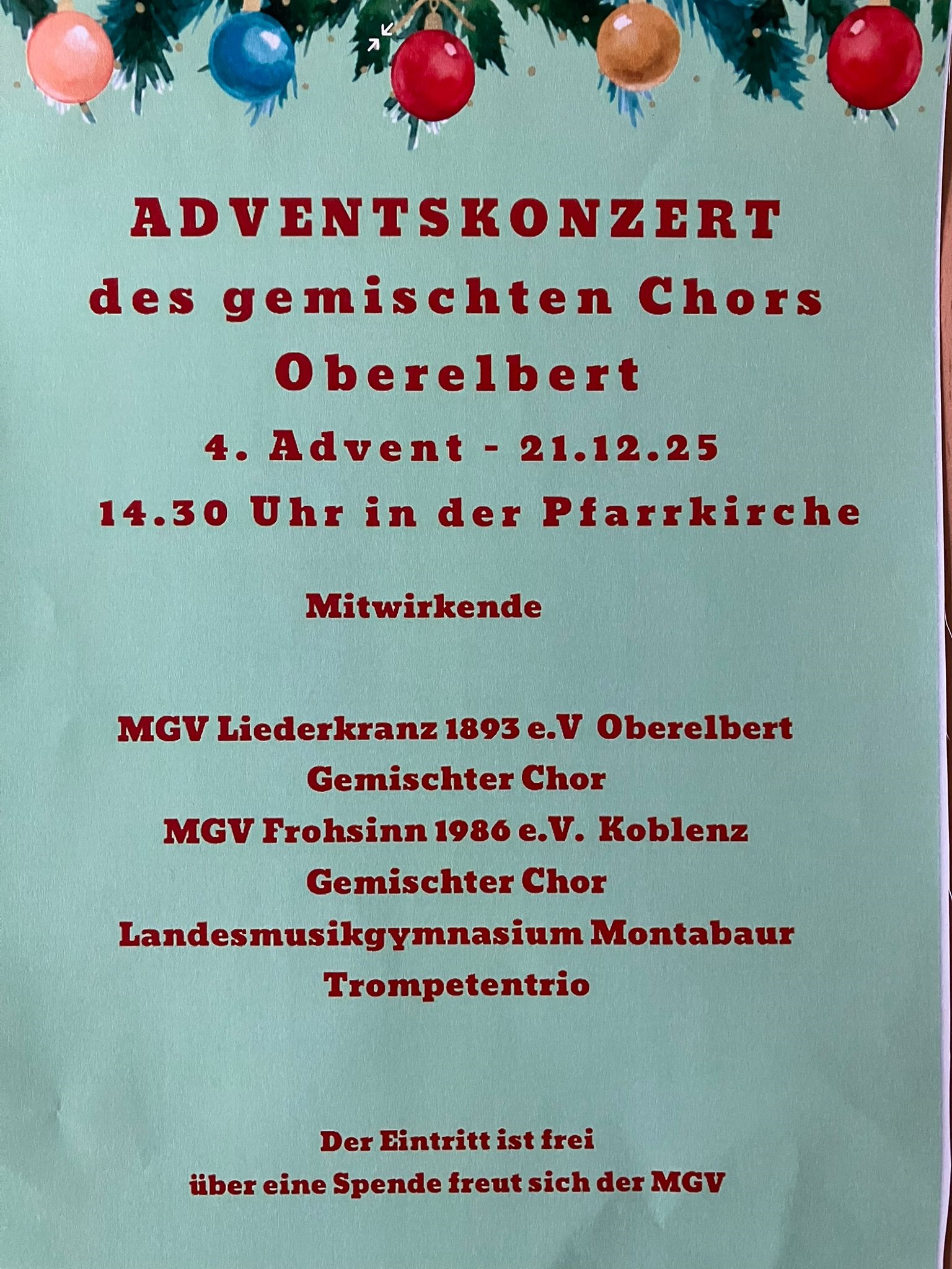 Adventskonzert des gemischten Chores Adventskonzert des gemischten Chores + Zu Google Kalender hinzufügen + iCal / Outlook exportieren 00 Tage 00 Stunden 00 Minuten 00 Sekunden Datum 21 Dez. 2025 Uhrzeit 14:30 Labels Oberelbert Standort Oberelbert Kategorie Musik / Konzerte Teile diese Veranstaltung