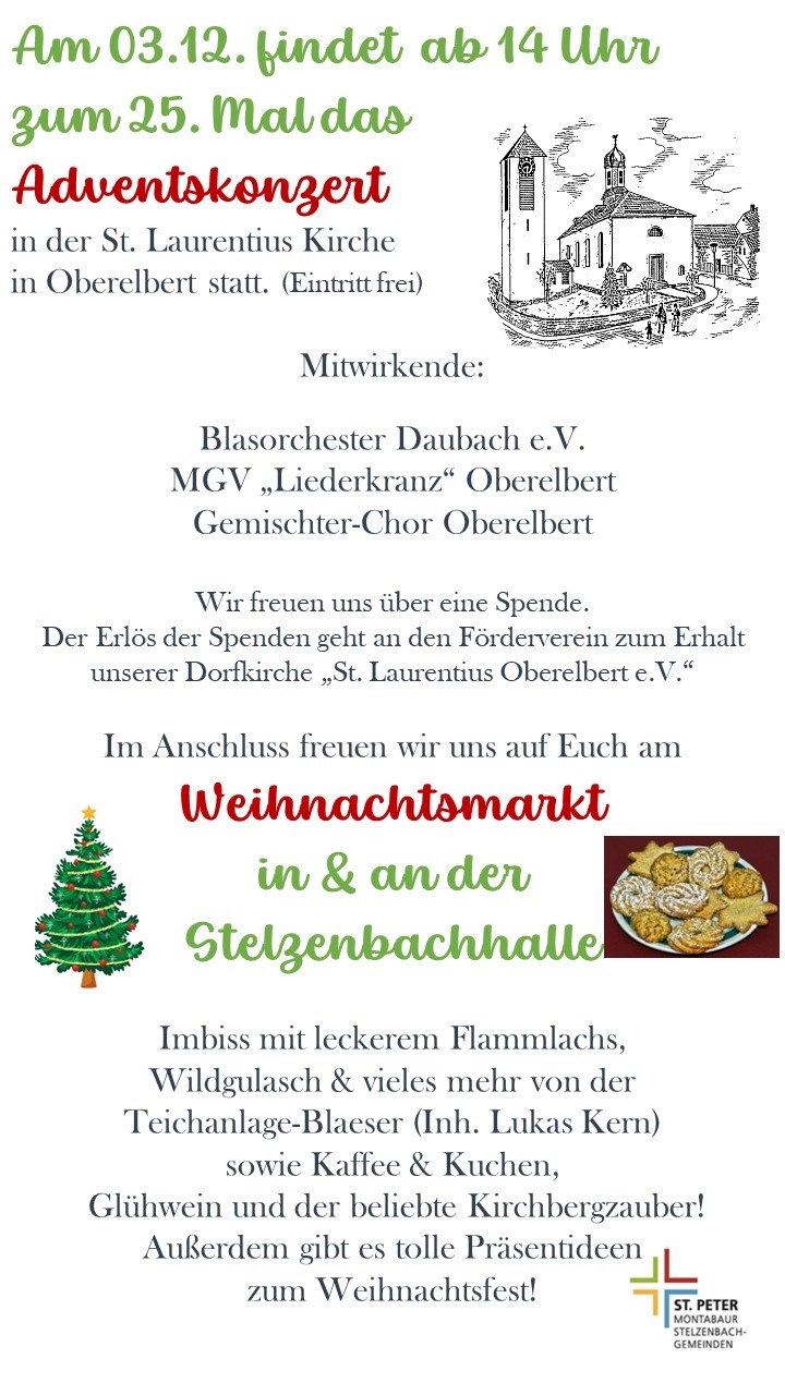 Adventskonzert und Weihnachtsmarkt in Oberelbert + Zu Google Kalender hinzufügen + iCal / Outlook exportieren Die Veranstaltung ist beendet. Datum 03 Dez. 2023 Abgelaufen! Uhrzeit 08:00 Preis 0,00 Standort Stelzenbachhalle Oberelbert Backhausstraße 3, 56412 Oberelbert, Deutschland Kategorie Essen / Genuss Kinder / Familie Märkte / Shopping Musik / Konzerte Teile diese Veranstaltung