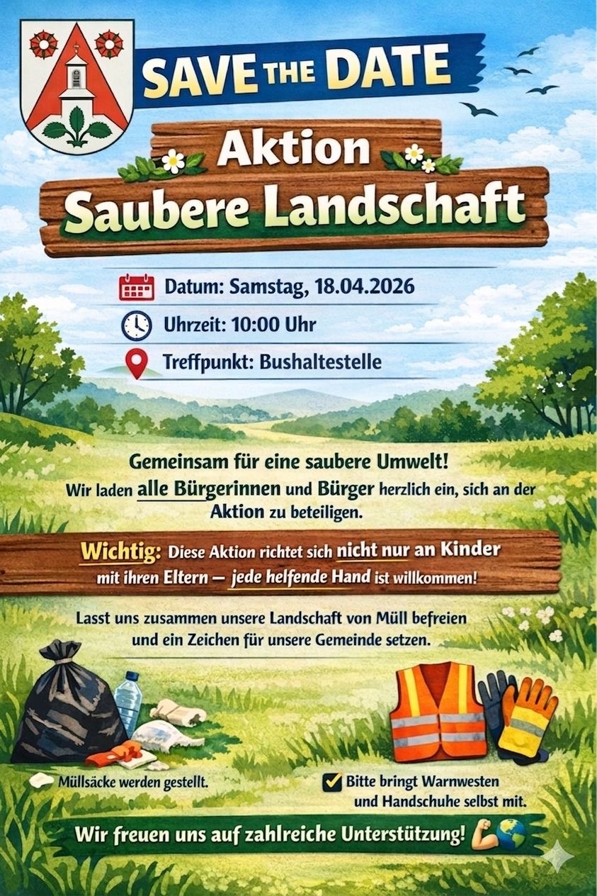 Aktion “Saubere Landschaft” Untershausen Aktion “Saubere Landschaft” Untershausen + Zu Google Kalender hinzufügen + iCal / Outlook exportieren 00 Tage 00 Stunden 00 Minuten 00 Sekunden Datum 18 Apr. 2026 Uhrzeit 10:00 Labels Untershausen Standort Untershausen Kategorie Natur / Landschaft Teile diese Veranstaltung
