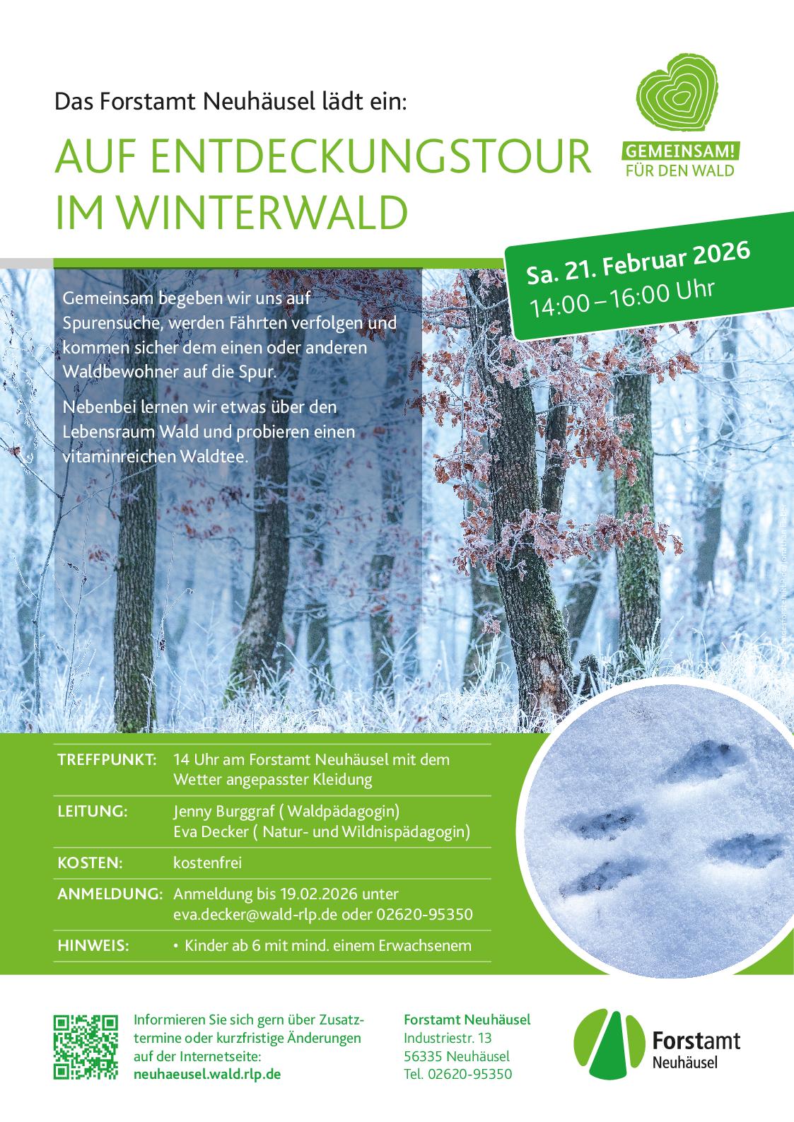 Treffpunkt ist beim Forstamt Neuhäusel, Industriestr. 13, am 21.2. um 14 Uhr (Dauer 2 Stunden). Anmeldung bis zum 19.2. bitte unter eva.decker@wald-rlp.de oder 02620 95350.
