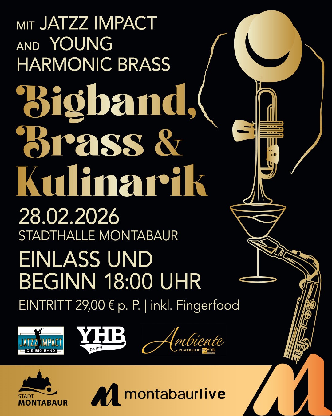 Erlebe am Samstag, den 28. Februar 2026, in der Stadthalle Haus Mons Tabor ein einzigartiges Event, dass alle Sinne anspricht. Das Ensemble Young Harmonic Brass und die Bigband JatzzImpact entführen uns in eine Welt voller Musik, Geschmack und Atmosphäre.