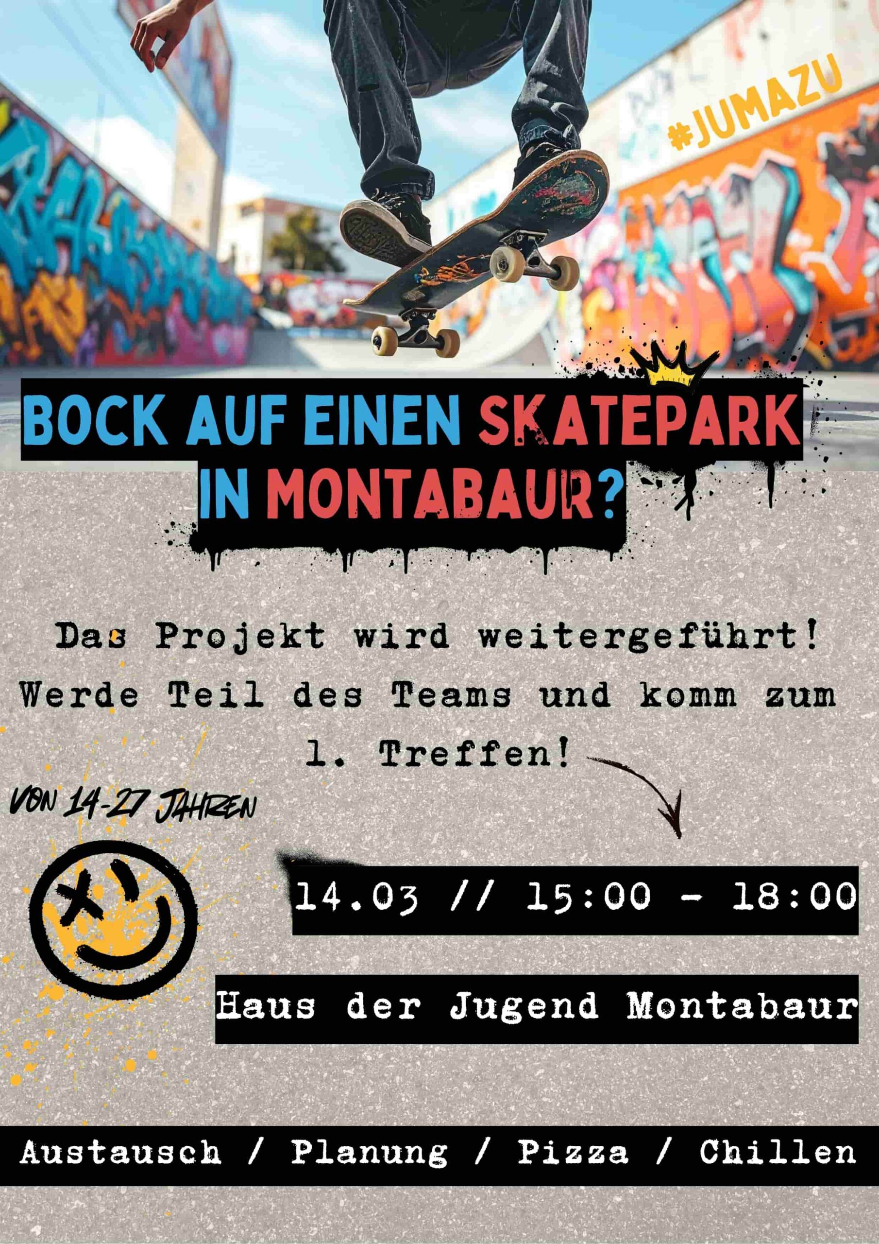 Bock auf einen Skatepark in Montabaur? Werde Teil des Teams und komm zum 1. Treffen + Zu Google Kalender hinzufügen + iCal / Outlook exportieren 00 Tage 00 Stunden 00 Minuten 00 Sekunden Datum 14 März 2026 Uhrzeit 15:00 Labels Montabaur Standort 56410 Montabaur Kategorie Wissen / Vortrag Teile diese Veranstaltung