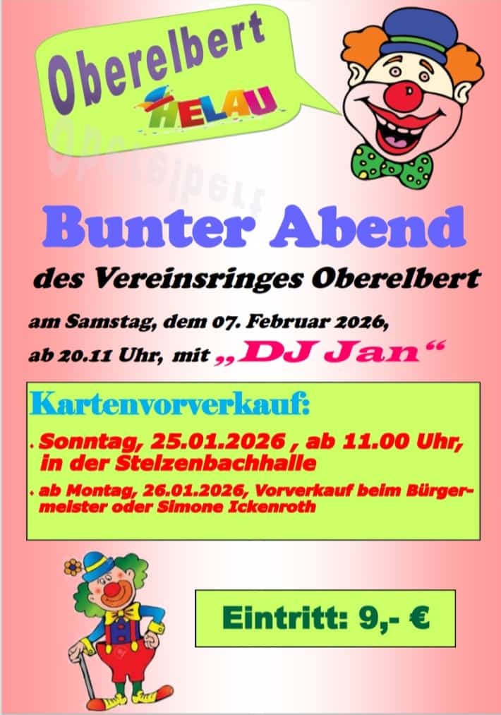 Bunter Abend Stelzenbachhalle + Zu Google Kalender hinzufügen + iCal / Outlook exportieren Die Veranstaltung ist beendet. Datum 07 Feb. 2026 Abgelaufen! Uhrzeit 20:10 Labels Oberelbert Standort Oberelbert Kategorie Feste / Brauchtum Teile diese Veranstaltung