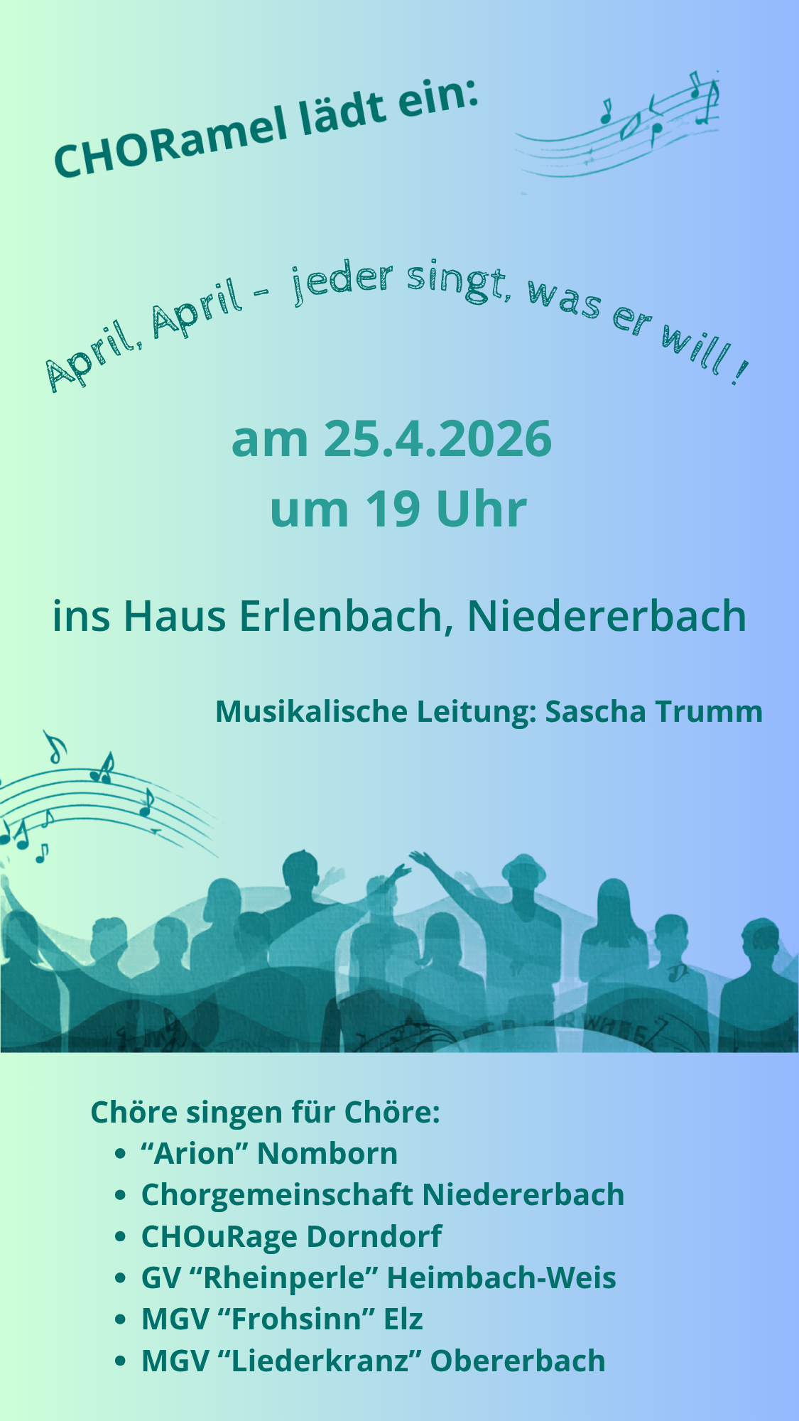 CHORamel Niedererbach CHORamel Niedererbach + Zu Google Kalender hinzufügen + iCal / Outlook exportieren 00 Tage 00 Stunden 00 Minuten 00 Sekunden Datum 25 Apr. 2026 Uhrzeit 19:00 Labels Niedererbach Standort Niedererbach Kategorie Musik / Konzerte Teile diese Veranstaltung