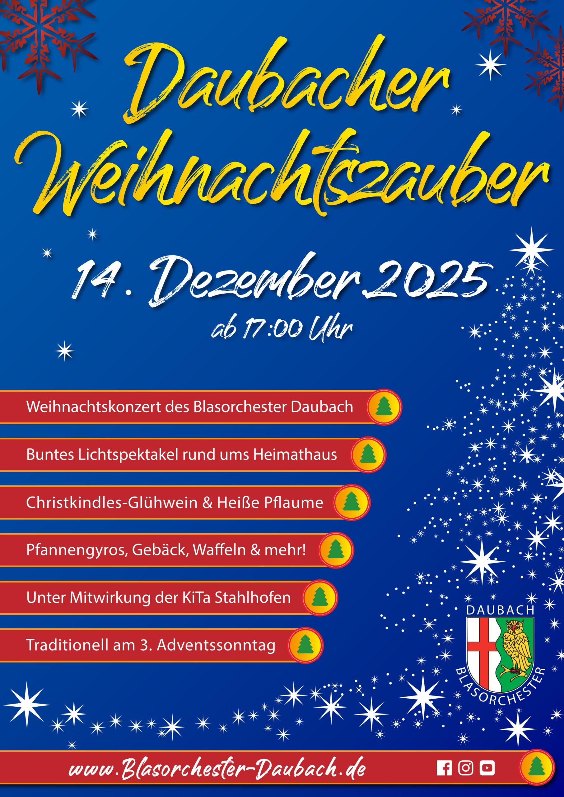 Daubacher Weihnachtszauber Daubacher Weihnachtszauber + Zu Google Kalender hinzufügen + iCal / Outlook exportieren 00 Tage 00 Stunden 00 Minuten 00 Sekunden Datum 14 Dez. 2025 Uhrzeit 17:00 Labels Daubach Standort Heimathaus Daubach Hauptstraße 25 56412 Daubach Kategorie Feste / Brauchtum Kinder / Familie Märkte / Shopping Musik / Konzerte Teile diese Veranstaltung