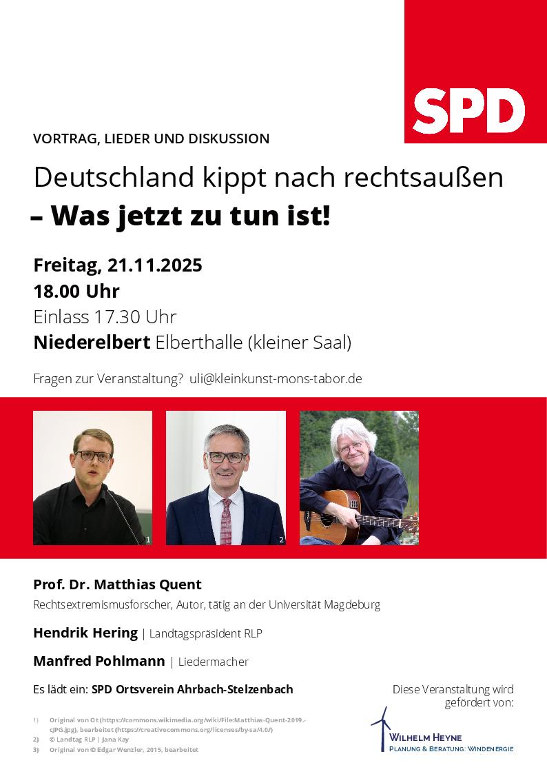 Deutschland kippt nach rechtsaußen – Was jetzt zu tun ist Elberthalle + Zu Google Kalender hinzufügen + iCal / Outlook exportieren Die Veranstaltung ist beendet. Datum 21 Nov. 2025 Abgelaufen! Uhrzeit 18:00 Labels Niederelbert Standort Niederelbert Kategorie Wissen / Vortrag Teile diese Veranstaltung