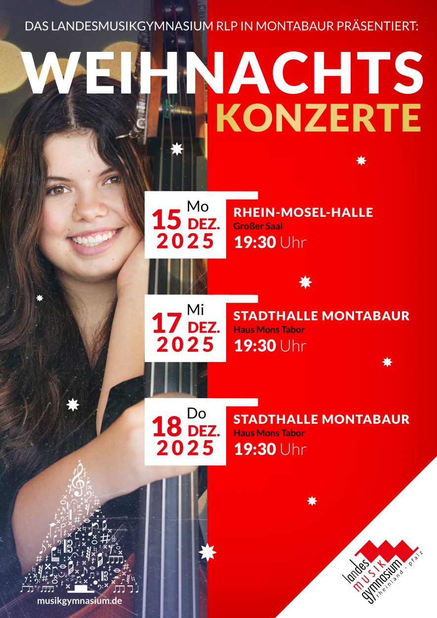 Die Konzerte finden in diesem Jahr Montag, 15.12. in der Rhein-Mosel-Halle Koblenz sowie Mittwoch, 17.12. und Donnerstag 18.12. im Haus Mons Tabor jeweils ab 19:30 Uhr statt. Freuen Sie sich auf drei abwechslungsreiche abendfüllende Konzertprogramme, die sowohl von den zahlreichen Ensembles der Schule wie Sinfonie- und Kammerorchester, Sinfonisches Blasorchester, Big Bands, klangstarker Chöre und verschiedener Kammermusikensembles als auch von starken Solisten gestaltet werden. Sie alle zeigen die große Bandbreite von Musik und zugleich die an dieser einzigartigen Schule in Rheinland-Pfalz mögliche hohe niveauvolle musikalische Ausbildung, das in diesem Jahr erneut durch eine Reihe von Preisen und großartigen Konzerten bestätigt wurde.