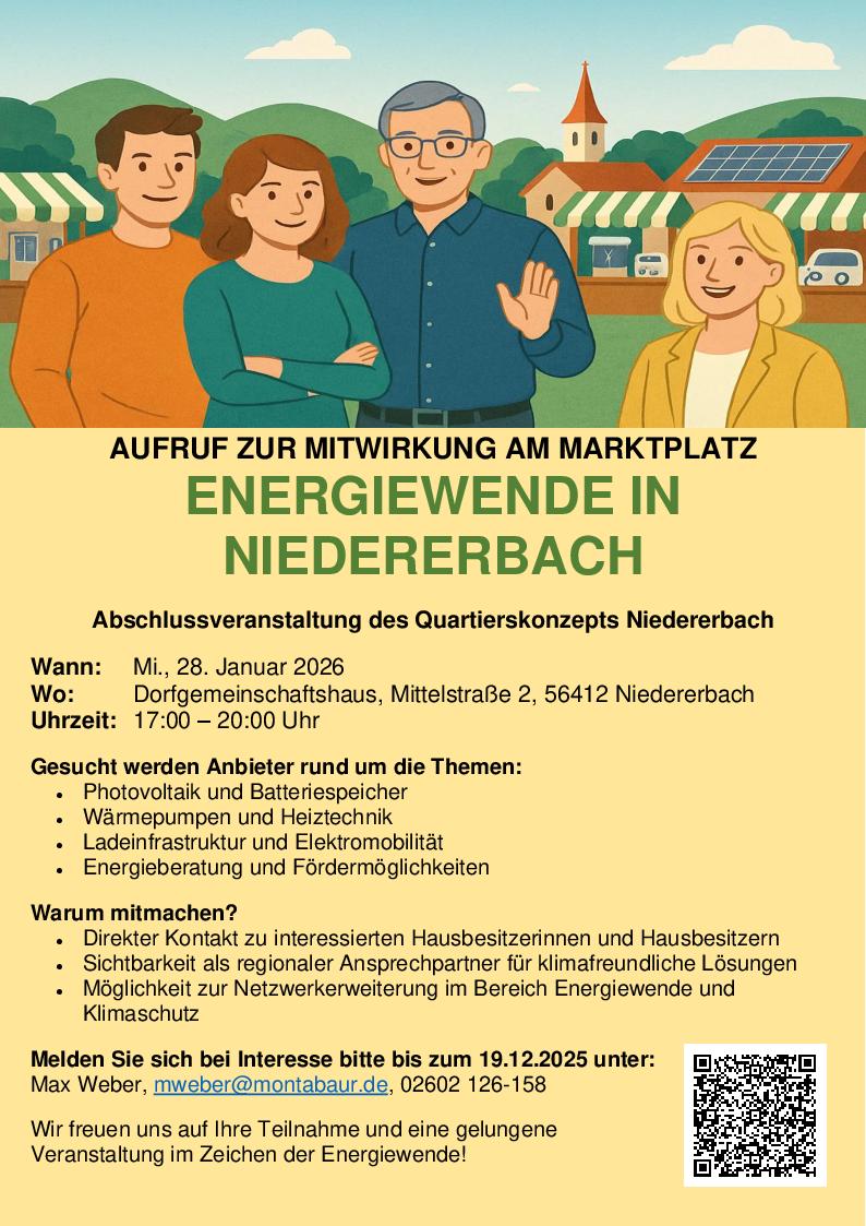Energiewende in Niedererbach Aufruf zur Mitwirkung am Marktplatz + Zu Google Kalender hinzufügen + iCal / Outlook exportieren 00 Tage 00 Stunden 00 Minuten 00 Sekunden Datum 28 Jan. 2026 Uhrzeit 17:00 Labels Niedererbach Standort Niedererbach Kategorie Wissen / Vortrag Teile diese Veranstaltung