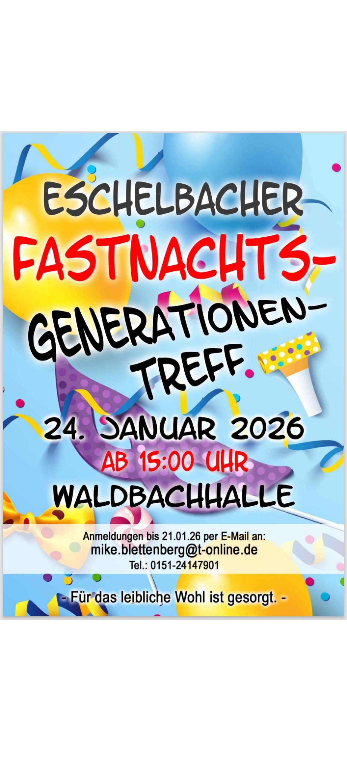 Fastnachtsgenerationentreff Waldbachhalle + Zu Google Kalender hinzufügen + iCal / Outlook exportieren Die Veranstaltung ist beendet. Datum 24 Jan. 2026 Abgelaufen! Uhrzeit 15:00 Labels MT-Eschelbach Standort Montabaur-Eschelbach Kategorie Feste / Brauchtum Teile diese Veranstaltung