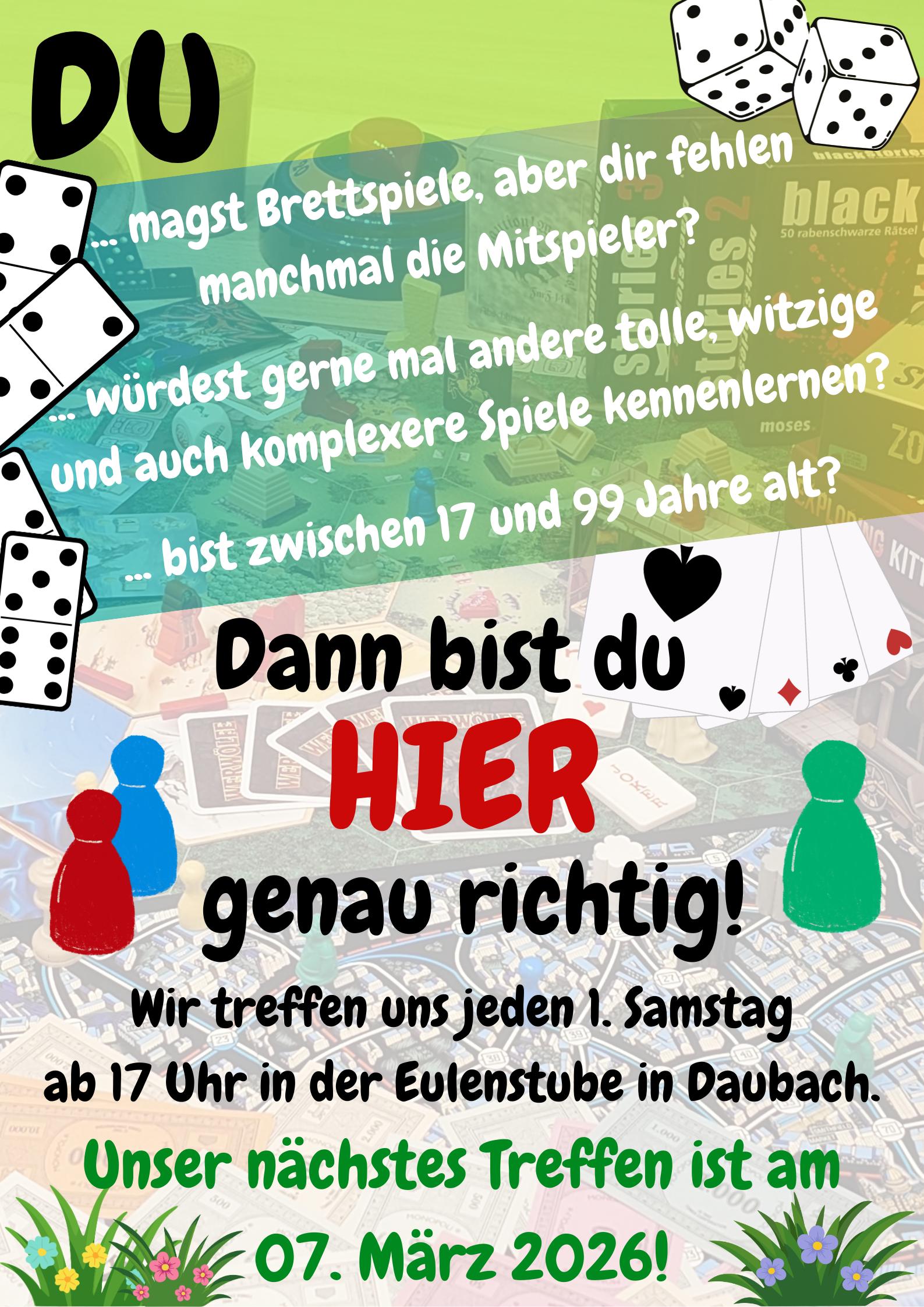 Freunde des gepflegten Brettspieles – Spieleabend im März Eulenstube + Zu Google Kalender hinzufügen + iCal / Outlook exportieren Die Veranstaltung ist beendet. Datum 07 März 2026 Abgelaufen! Uhrzeit 17:00 Labels Daubach Standort Daubach Kategorie Feste / Brauchtum Teile diese Veranstaltung