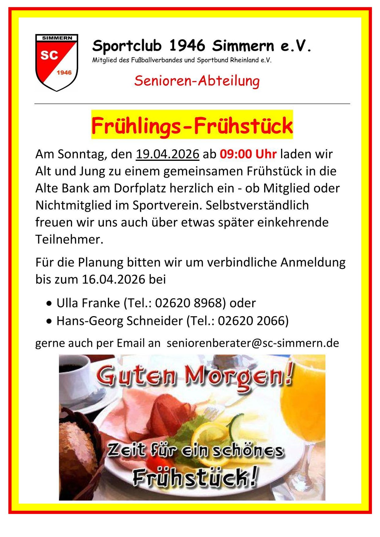 Frühlingsfrühstück SC Simmern Frühlingsfrühstück SC Simmern + Zu Google Kalender hinzufügen + iCal / Outlook exportieren 00 Tage 00 Stunden 00 Minuten 00 Sekunden Datum 19 Apr. 2026 Uhrzeit 09:00 Labels Simmern Standort Simmern Kategorie Essen / Genuss Wissen / Vortrag Teile diese Veranstaltung