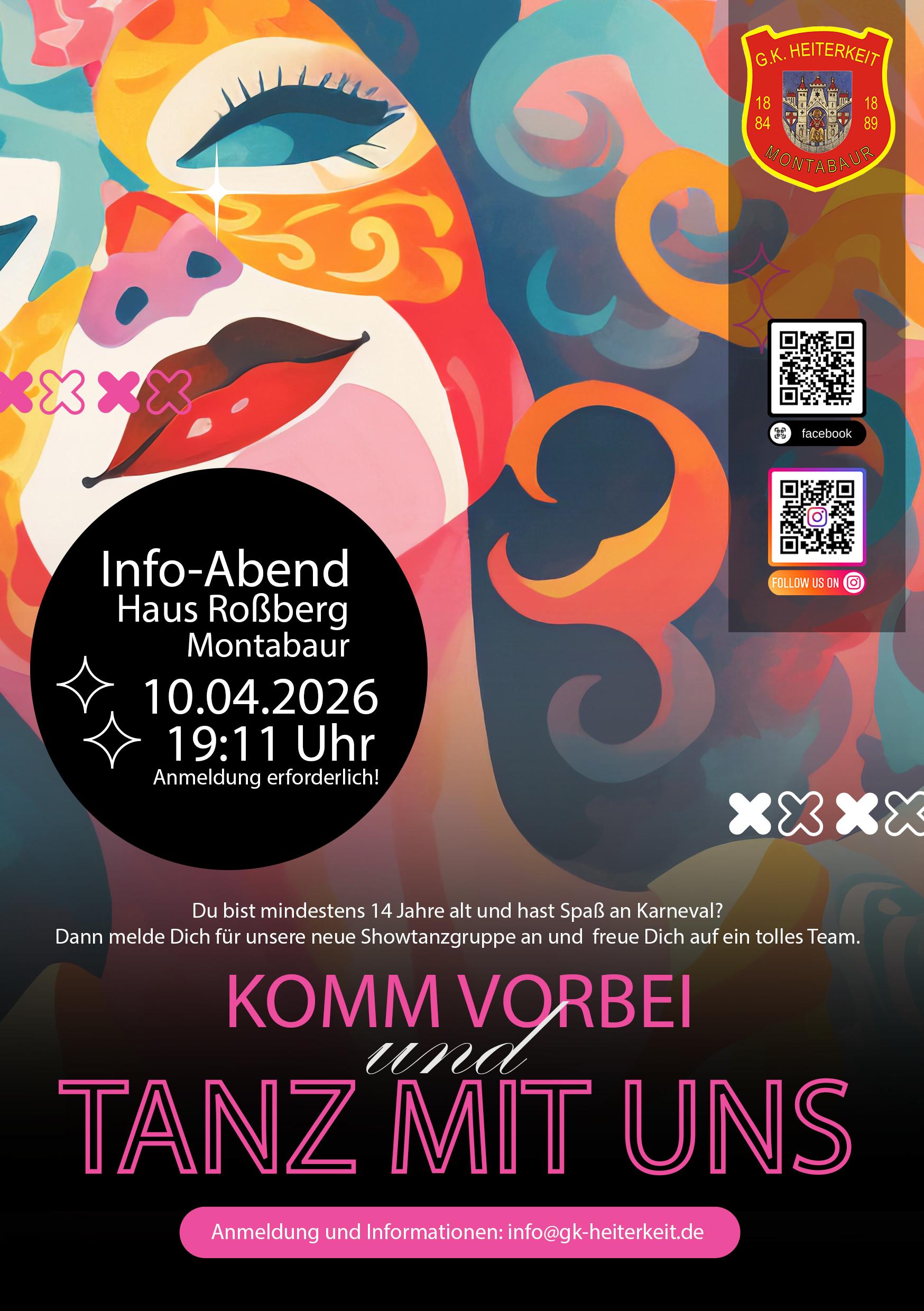 GK Heiterkeit 1884/89 e. V. Montabaur – Info-Abend zur Gründung einer neuen Showtanzgruppe Haus Roßberg + Zu Google Kalender hinzufügen + iCal / Outlook exportieren 00 Tage 00 Stunden 00 Minuten 00 Sekunden Datum 10 Apr. 2026 Uhrzeit 19:10 Labels Montabaur Standort 56410 Montabaur Kategorie Feste / Brauchtum Gesundheit / Sport Teile diese Veranstaltung