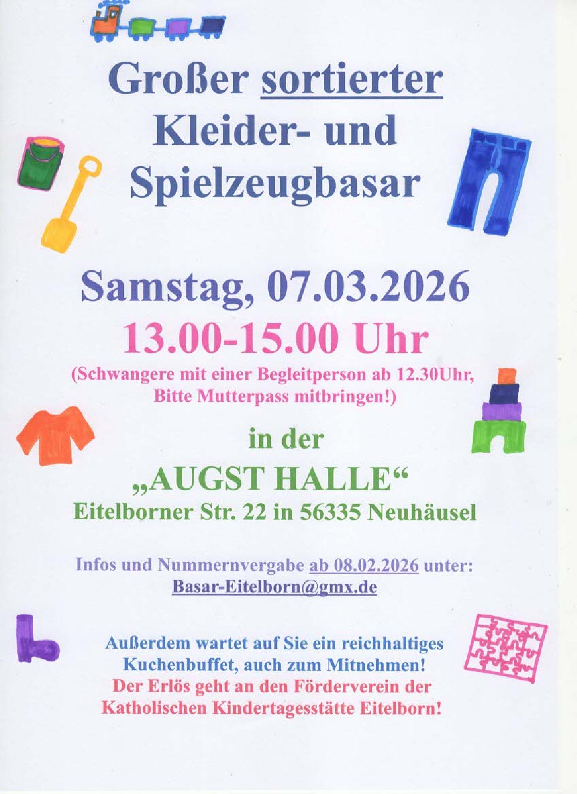 Großer sortierter Kleider- und Spielzeugbasar Augsthalle + Zu Google Kalender hinzufügen + iCal / Outlook exportieren 00 Tage 00 Stunden 00 Minuten 00 Sekunden Datum 07 März 2026 Uhrzeit 13:00 Labels Neuhäusel Standort Neuhäusel Kategorie Märkte / Shopping Teile diese Veranstaltung