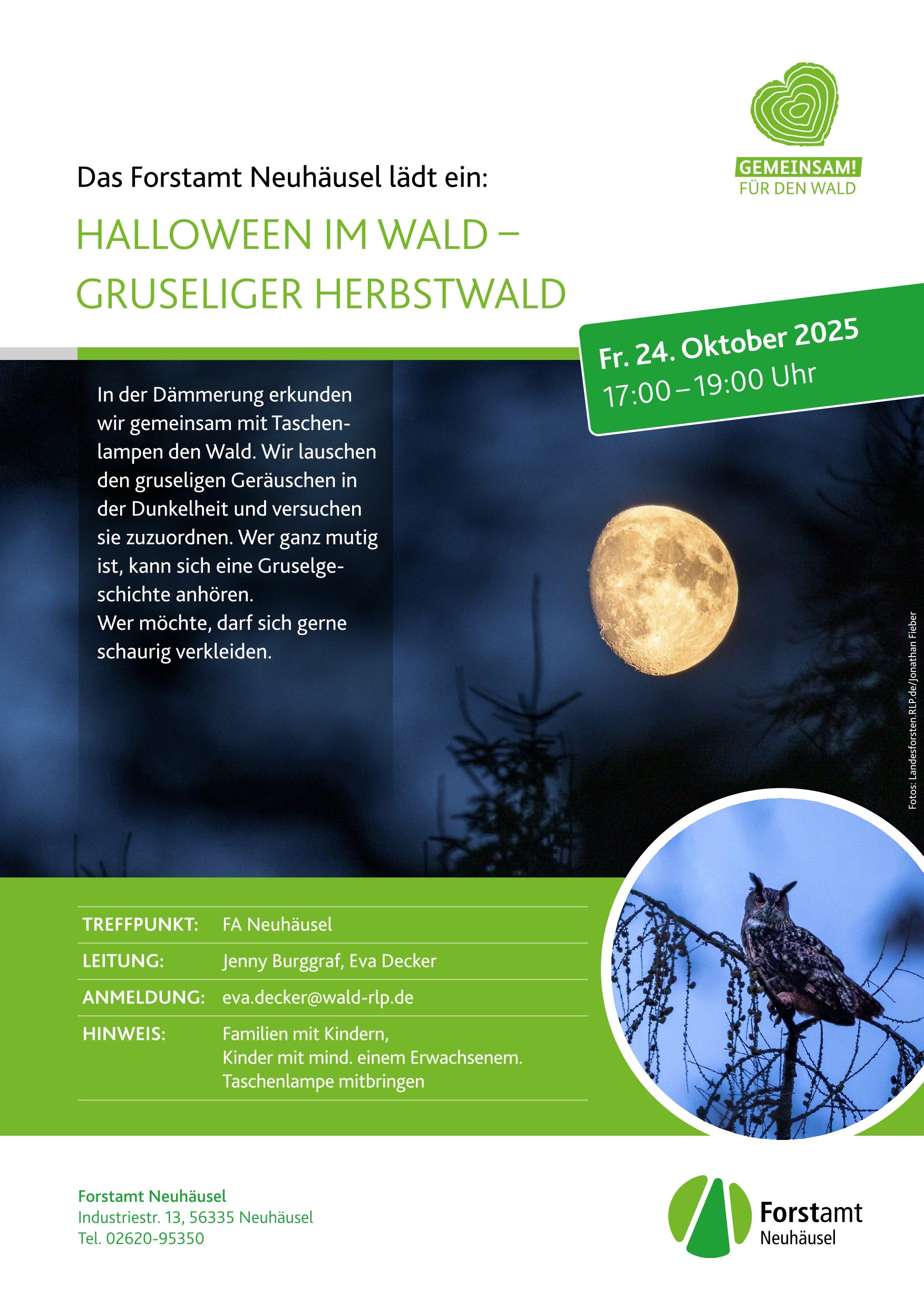 Treffpunkt ist beim Forstamt Neuhäusel, Industriestraße 13, Neuhäusel, am 24.10. um 17 Uhr (Dauer 2 Stunden). Anmeldung bis zum 23.10. bitte unter eva.decker@wald-rlp.de.