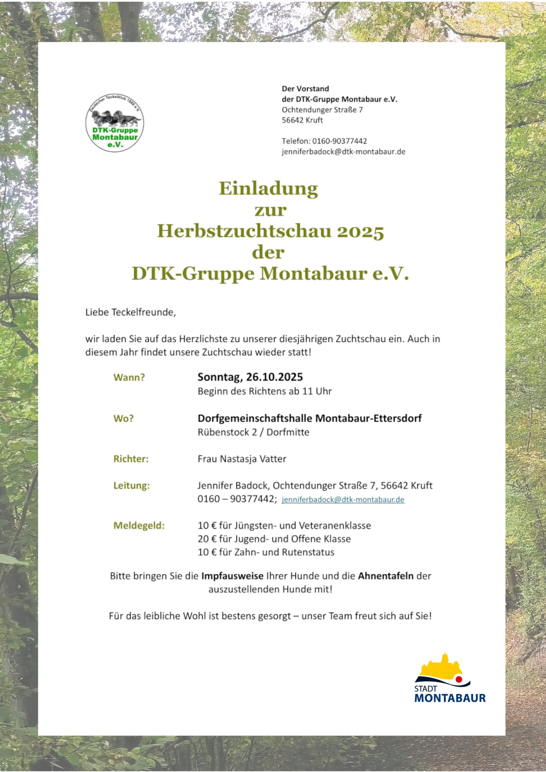 Herbstzuchtschau 2025 der DTK-Gruppe Montabaur Herbstzuchtschau 2025 der DTK-Gruppe Montabaur + Zu Google Kalender hinzufügen + iCal / Outlook exportieren 00 Tage 00 Stunden 00 Minuten 00 Sekunden Datum 26 Okt. 2025 Uhrzeit 11:00 Preis 20.00€ Labels Montabaur,MT-Ettersdorf Standort Montabaur-Ettersdorf Kategorie Wissen / Vortrag Teile diese Veranstaltung