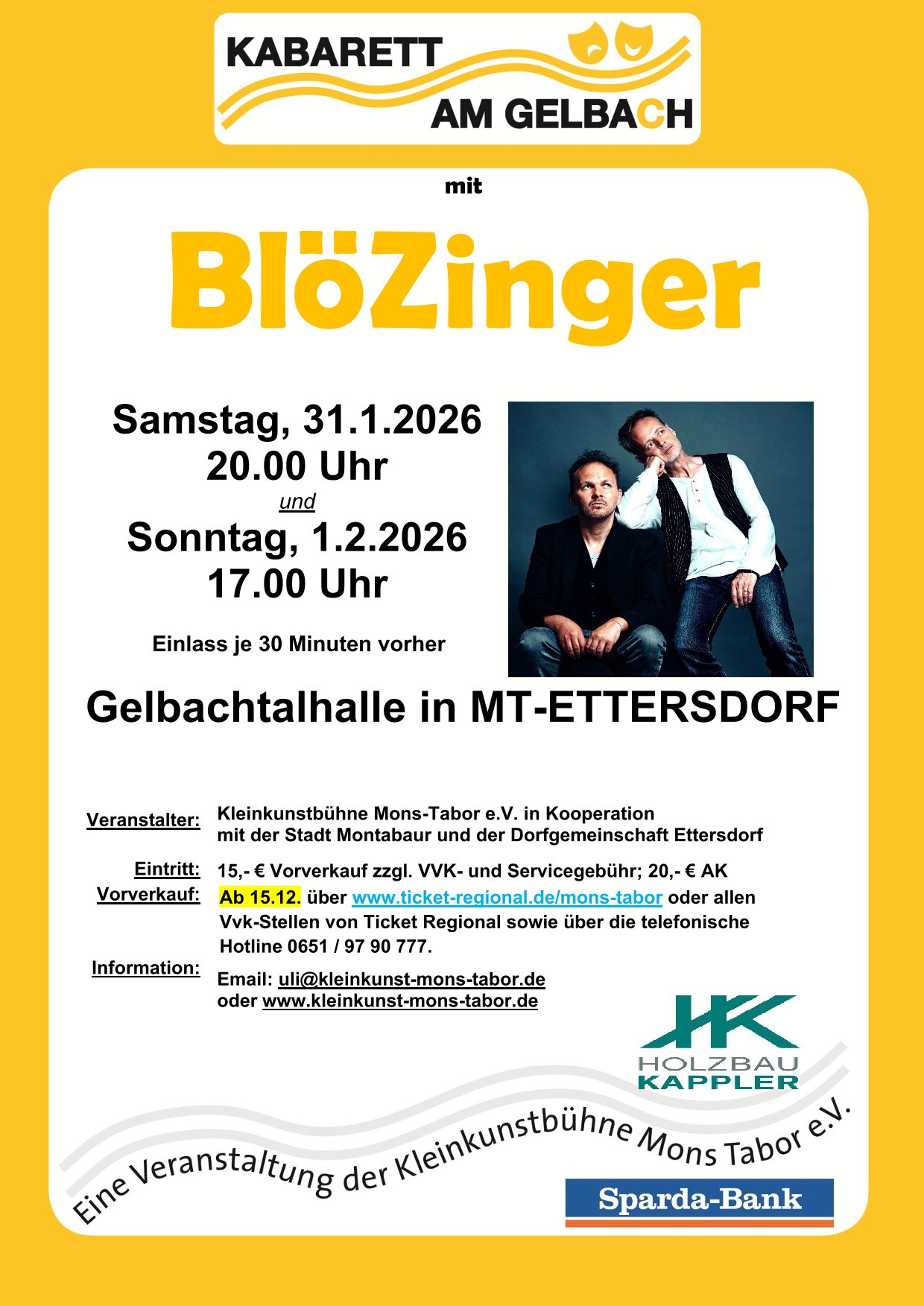 Kabarett am Gelbach “BlöZinger” Kabarett am Gelbach “BlöZinger” + Zu Google Kalender hinzufügen + iCal / Outlook exportieren 00 Tage 00 Stunden 00 Minuten 00 Sekunden Datum 31 Jan. 2026 Uhrzeit 20:00 Preis 15.00€ Labels MT-Ettersdorf Standort Montabaur-Ettersdorf Kategorie Kunst / Literatur Musik / Konzerte Teile diese Veranstaltung