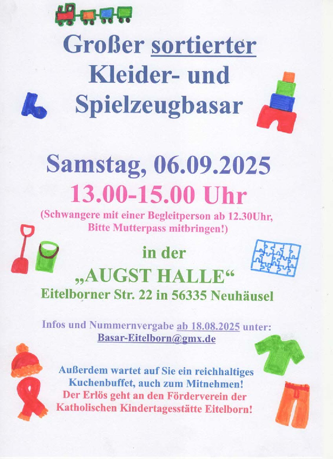 KInderkleider- & Spielzeugbasar Augsthalle + Zu Google Kalender hinzufügen + iCal / Outlook exportieren Die Veranstaltung ist beendet. Datum 06 Sep. 2025 Abgelaufen! Uhrzeit 13:00 Labels Neuhäusel Standort Neuhäusel Kategorie Kinder / Familie Märkte / Shopping Teile diese Veranstaltung