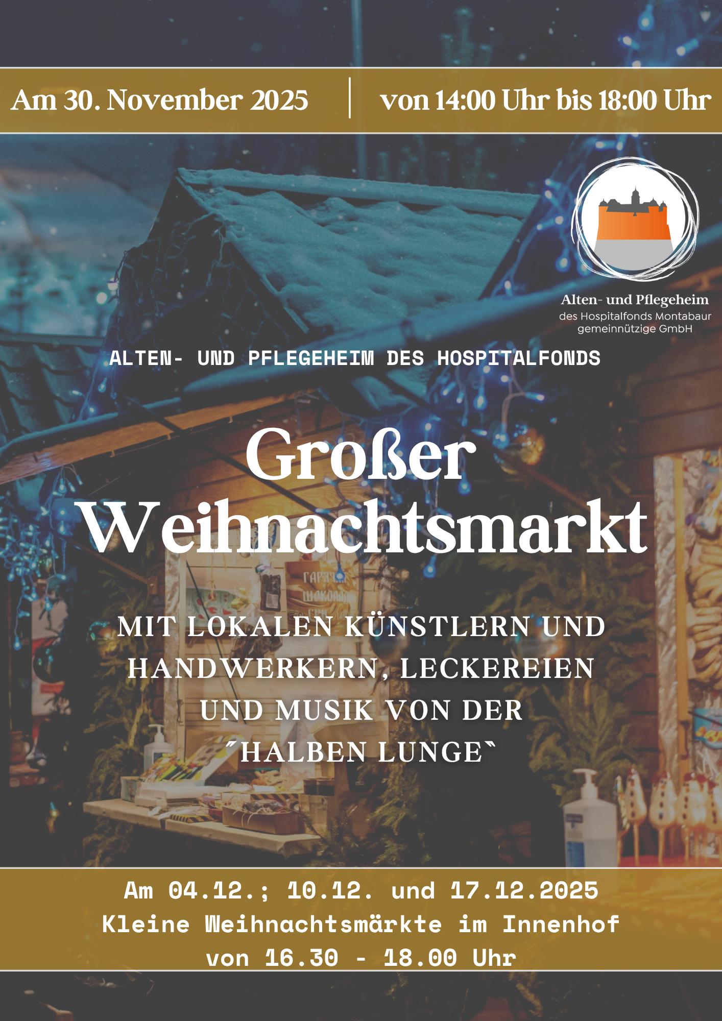 Kleiner Weihnachtsmarkt im Alten- und Pflegeheim des Hospitalfonds Montabaur Innenhof + Zu Google Kalender hinzufügen + iCal / Outlook exportieren 00 Tage 00 Stunden 00 Minuten 00 Sekunden Datum 17 Dez. 2025 Uhrzeit 16:30 Labels Montabaur Standort 56410 Montabaur Kategorie Feste / Brauchtum Märkte / Shopping Teile diese Veranstaltung