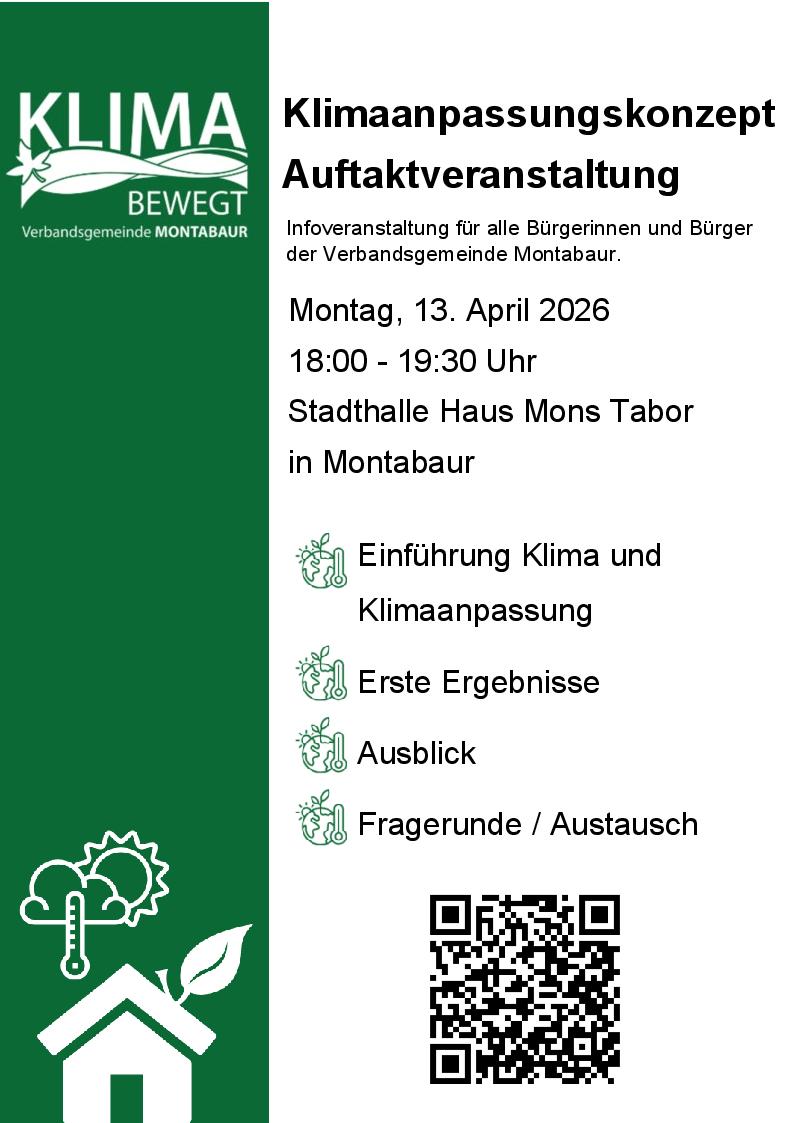 Klimaanpassungskonzept – Auftaktveranstaltung Stadthalle Haus Mons Tabor + Zu Google Kalender hinzufügen + iCal / Outlook exportieren 00 Tage 00 Stunden 00 Minuten 00 Sekunden Datum 13 Apr. 2026 Uhrzeit 18:00 Labels Montabaur Standort 56410 Montabaur Kategorie Wissen / Vortrag Teile diese Veranstaltung