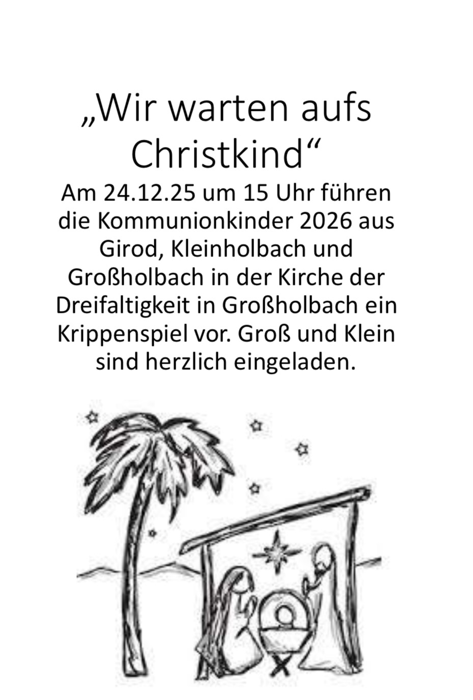 Krippenspiel “Wir warten aufs Christkind” Krippenspiel “Wir warten aufs Christkind” + Zu Google Kalender hinzufügen + iCal / Outlook exportieren 00 Tage 00 Stunden 00 Minuten 00 Sekunden Datum 24 Dez. 2025 Uhrzeit 15:00 Labels Girod,Großholbach Standort Großholbach Kategorie Feste / Brauchtum Kinder / Familie Teile diese Veranstaltung