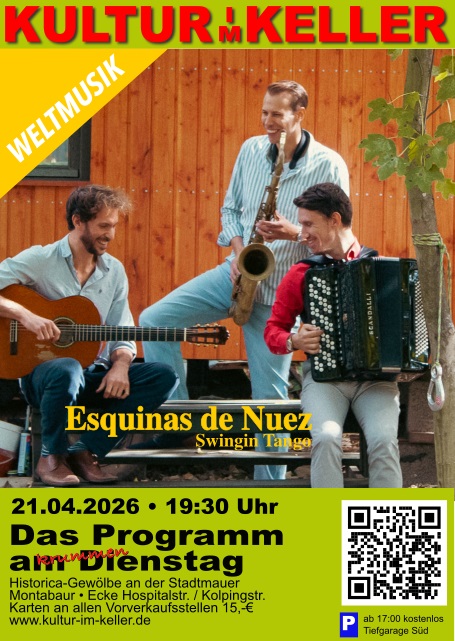 Kultur im Keller “Esquinas de Nuez” Kultur im Keller “Esquinas de Nuez” + Zu Google Kalender hinzufügen + iCal / Outlook exportieren 00 Tage 00 Stunden 00 Minuten 00 Sekunden Datum 21 Apr. 2026 Uhrzeit 19:30 Preis 15.00€ Labels Montabaur Standort Montabaur Kategorie Musik / Konzerte Teile diese Veranstaltung