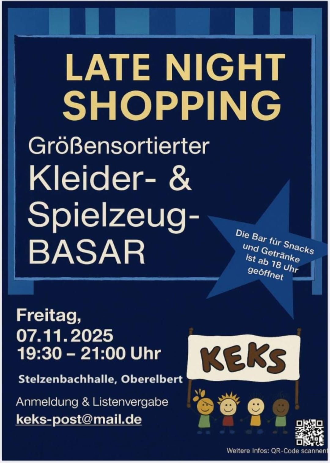 Late Night Shopping – KEKS Kleider- und Spielzeugbasar Late Night Shopping – KEKS Kleider- und Spielzeugbasar + Zu Google Kalender hinzufügen + iCal / Outlook exportieren 00 Tage 00 Stunden 00 Minuten 00 Sekunden Datum 07 Nov. 2025 Uhrzeit 19:30 Labels Oberelbert Standort Oberelbert Kategorie Märkte / Shopping Teile diese Veranstaltung