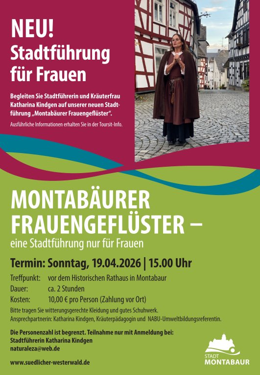 Montabäurer Frauengeflüster – Stadtführung nur für Frauen Montabäurer Frauengeflüster – Stadtführung nur für Frauen + Zu Google Kalender hinzufügen + iCal / Outlook exportieren 00 Tage 00 Stunden 00 Minuten 00 Sekunden Datum 19 Apr. 2026 Uhrzeit 15:00 Preis 10.00€ Labels Montabaur Standort Montabaur Kategorie Wissen / Vortrag Teile diese Veranstaltung