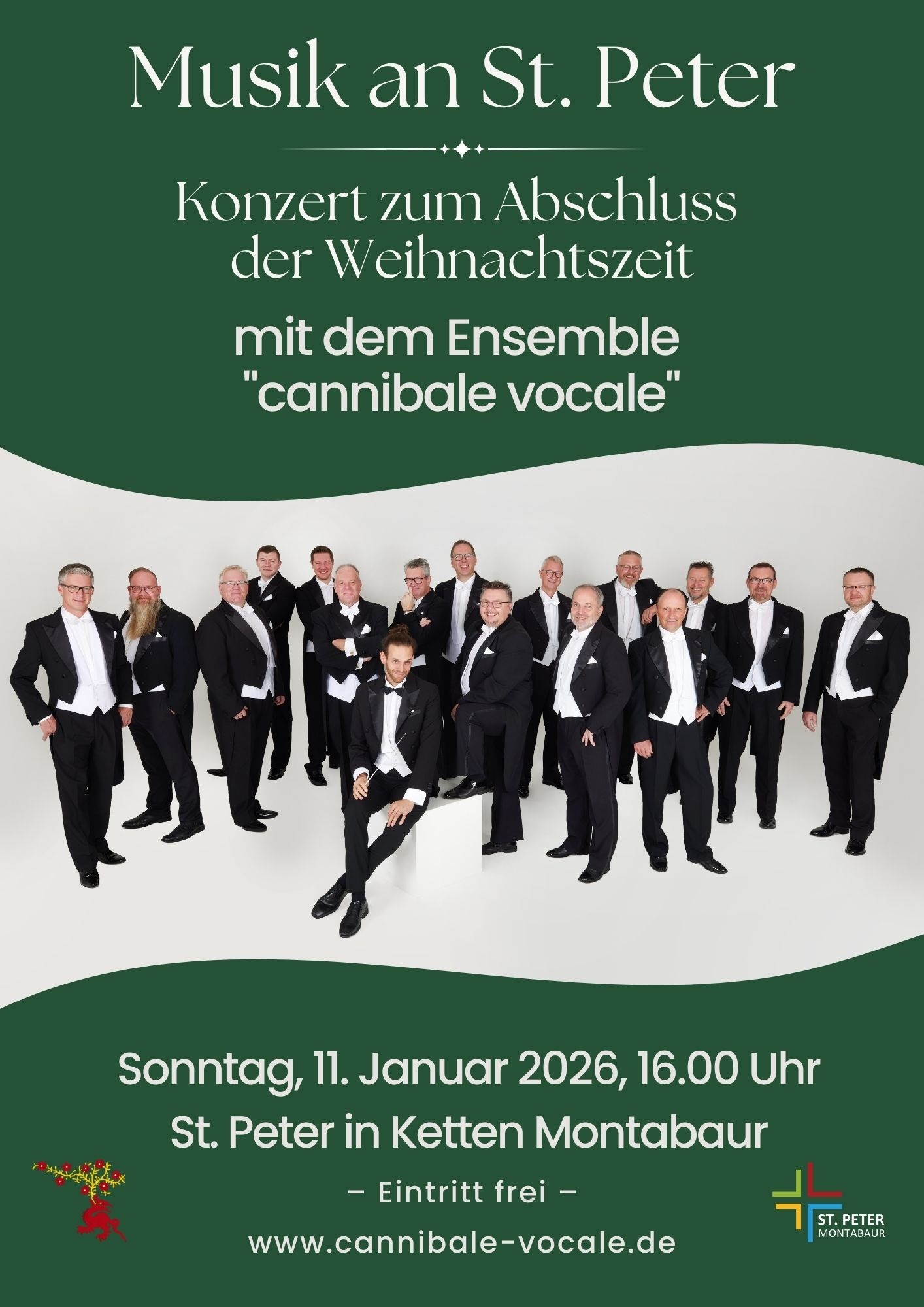 Das erste Konzert im Neuen Jahr der Reihe “Musik an St. Peter” steht noch ganz im Zeichen des Weihnachtsfestes. Zum Abschluss der liturgischen Weihnachtszeit präsentiert das a-cappella-Ensemble „cannibale vocale“ ein exquisites Programm mit deutschen und englischen Weihnachtsliedern sowie Auszügen aus dem aktuellen Programm „… von der Liebe!“. Die im südlichen Westerwald beheimateten Sänger können mit diversen Erfolgen bei renommierten Chorwettbewerben sowie Radio- und Fernsehaufnahmen bei BR und SWR aufwarten. Seit 2006 sind sie Veranstalter des „Westerwälder mundART a cappella Festivals“.