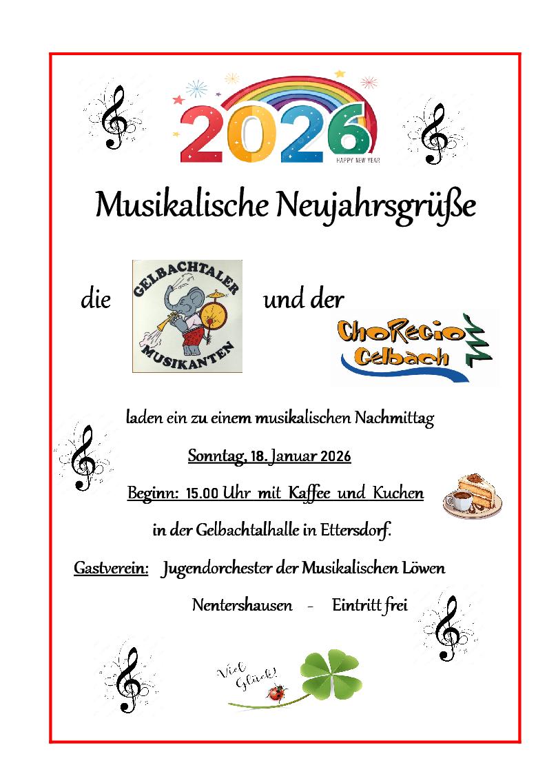 Musikalische Neujahrsgrüße Gelbachtalhalle Ettersdorf + Zu Google Kalender hinzufügen + iCal / Outlook exportieren Die Veranstaltung ist beendet. Datum 18 Jan. 2026 Abgelaufen! Uhrzeit 15:00 Labels MT-Ettersdorf Standort Montabaur-Ettersdorf Kategorie Musik / Konzerte Teile diese Veranstaltung