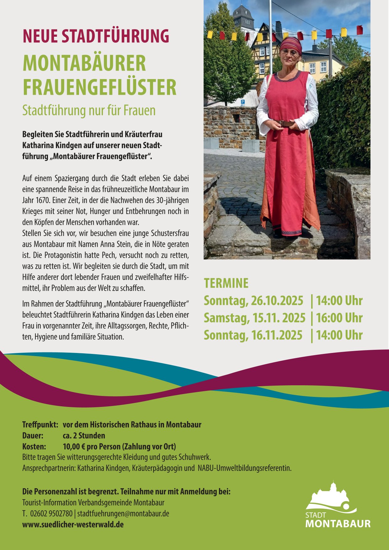 Neue Stadtführung „Montabäurer Frauengeflüster“ Neue Stadtführung „Montabäurer Frauengeflüster“ Treffpunkt: Rathaus, 18 Uhr + Zu Google Kalender hinzufügen + iCal / Outlook exportieren Die Veranstaltung ist beendet. Datum 26 Okt. 2025 Abgelaufen! Uhrzeit 18:00 Preis 10.00€ Labels Montabaur Standort Montabaur Kategorie Wissen / Vortrag Teile diese Veranstaltung