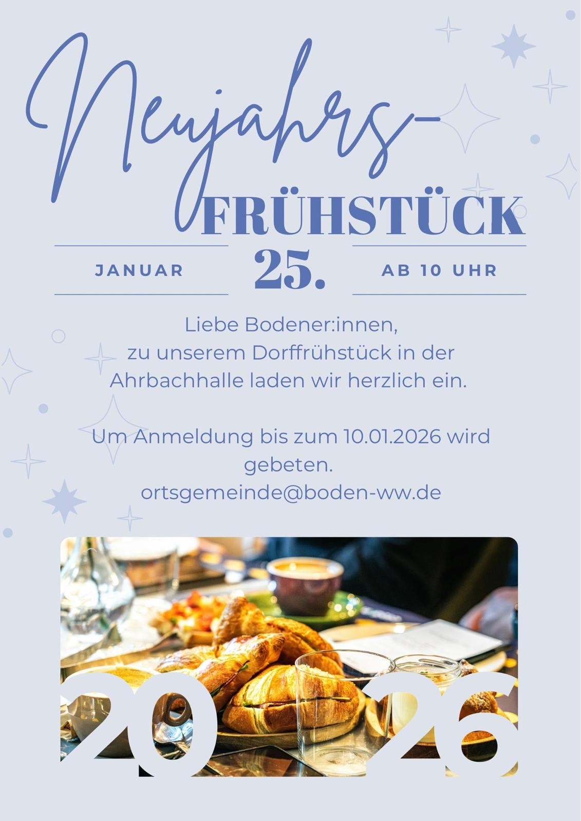 Neujahrs-Frühstück in Boden Neujahrs-Frühstück in Boden + Zu Google Kalender hinzufügen + iCal / Outlook exportieren 00 Tage 00 Stunden 00 Minuten 00 Sekunden Datum 25 Jan. 2026 Uhrzeit 08:00 Labels Boden Standort Boden, Ahrbachhalle Kategorie Essen / Genuss Teile diese Veranstaltung