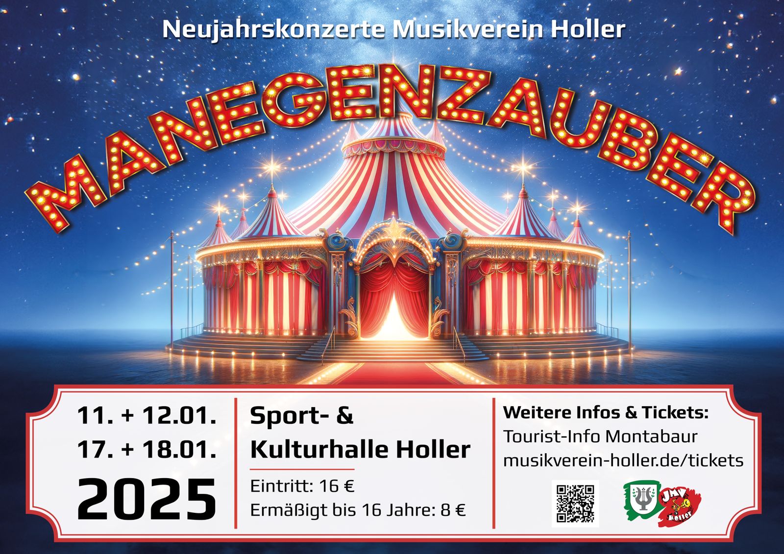 Jugendmusikverein und Musikverein Holler laden Sie zum Manegenzauber 2025 ganz herzlich in die Sport- und Kulturhalle nach Holler ein.