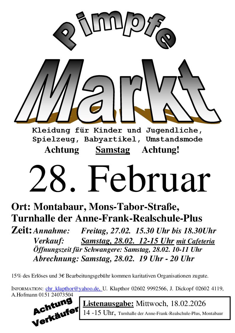 Die Pimpfe-Gruppe lädt zum 75. großen Basar für Kinder- und Teenagerbekleidung ein, der am Samstag, 28. Februar zwischen 12.00 Uhr und 15.00 Uhr in der Turnhalle der Anne-Frank-Realschule-Plus in Montabaur, Mons-Tabor-Straße stattfindet. Die Besucher erwartet ein reichhaltiges Angebot an Frühjahrs- und Sommerkleidung in allen Kindergrößen, Baby- und Umstandsartikeln, Schuhen, Spielsachen, Büchern, Kinderwagen, Fahrzeugen und mehr. Die Cafeteria bietet Getränke und leckere Kuchen, die die Schülerschaft der Anne-Frank-Schule mit großem Engagement für Sie vorbereitet.