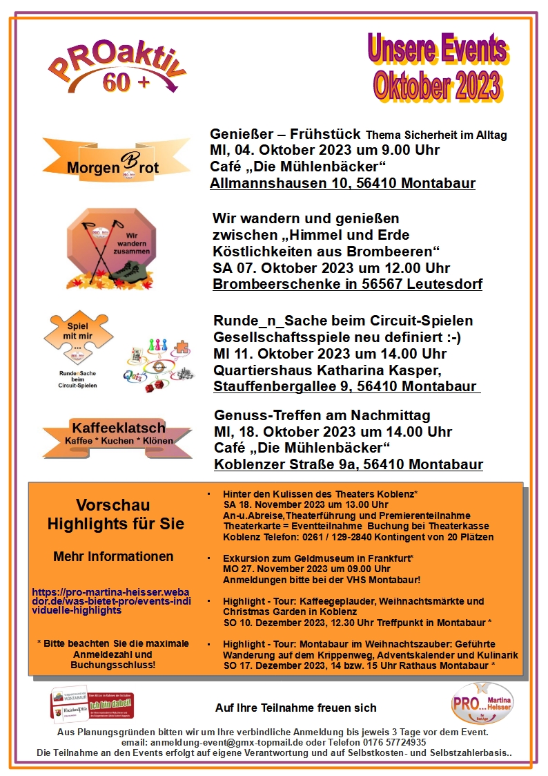 PROaktiv 60+ Events im Oktober 2023 Auch im Oktober haben wir wieder eine Auswahl verschiedenster Events für Sie… Herzlich willkommen! + Zu Google Kalender hinzufügen + iCal / Outlook exportieren Die Veranstaltung ist beendet. Datum 01 - 31 Okt. 2023 Abgelaufen! Weitere Informationen https://pro-martina-heisser.webador.de/aktuelle-events Standort Montabaur Kategorie Essen / Genuss Feste / Brauchtum Gesundheit / Sport Teile diese Veranstaltung