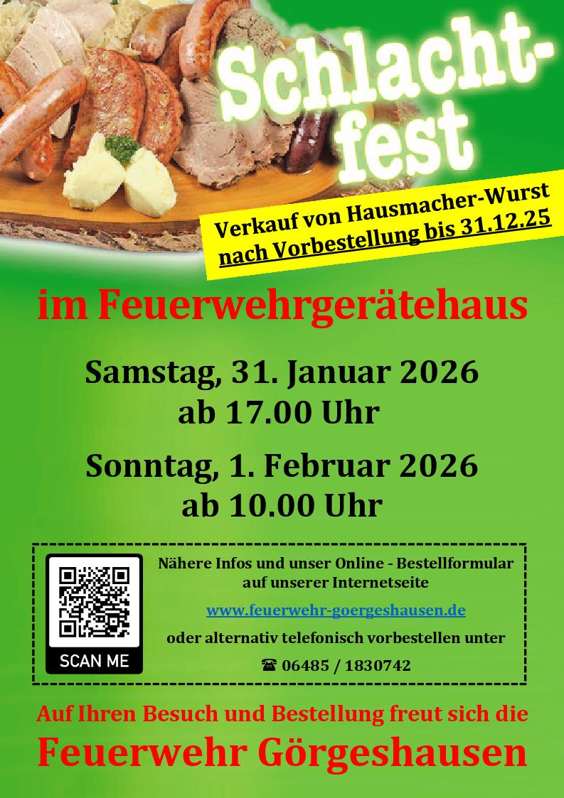 Schlachtfest der Freiwilligen Feuerwehr Görgeshausen Feuerwehrgerätehaus + Zu Google Kalender hinzufügen + iCal / Outlook exportieren 00 Tage 00 Stunden 00 Minuten 00 Sekunden Datum 31 Jan. 2026 - 01 Feb. 2026 Uhrzeit Ganztags Labels Görgeshausen Standort Görgeshausen Kategorie Essen / Genuss Feste / Brauchtum Teile diese Veranstaltung