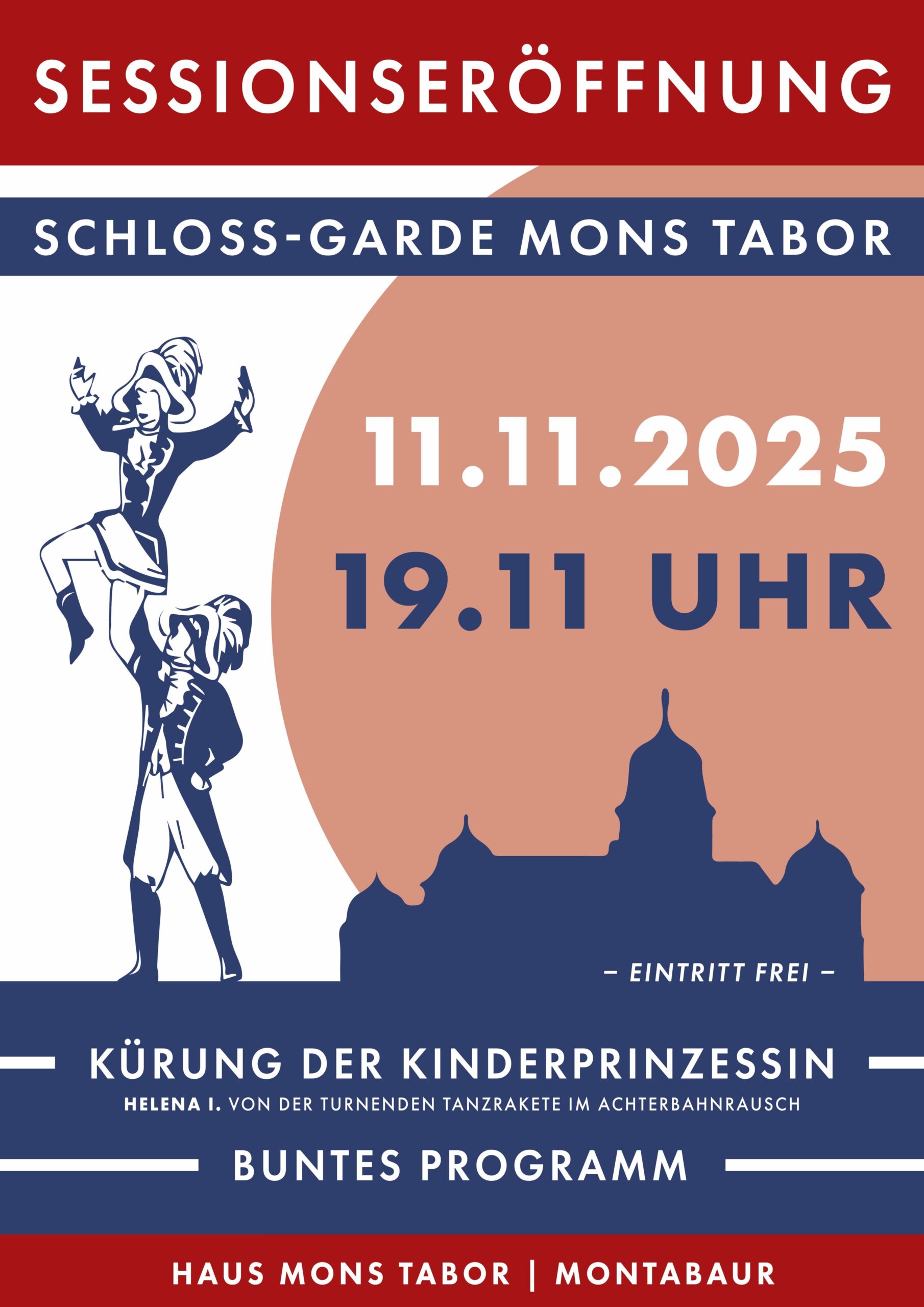 Traditionell startet die Schloss-Garde Mons Tabor am 11.11.2025 um 19:11 Uhr in die Session 2025/2026. Ein bunter Abend mit vielen Highlights sowie der Kürung der Kinderprinzessin 2025/2026 Helena I. von der turnenden Tanzrakete im Achterbahnrausch.