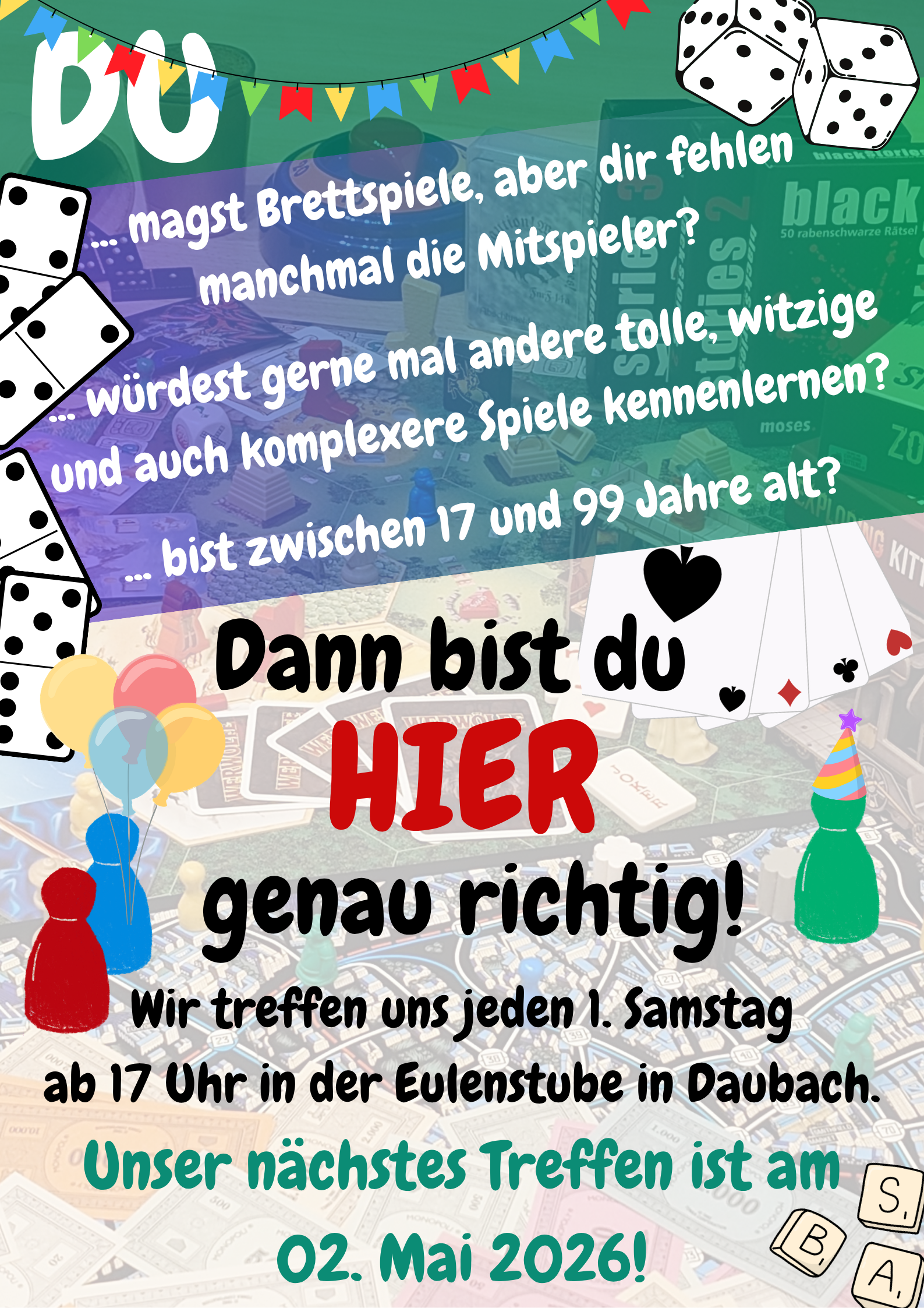 Spieleabend in Daubach Spieleabend in Daubach + Zu Google Kalender hinzufügen + iCal / Outlook exportieren 00 Tage 00 Stunden 00 Minuten 00 Sekunden Datum 02 Mai 2026 Uhrzeit 17:00 Labels Daubach Standort Daubach Kategorie Feste / Brauchtum Teile diese Veranstaltung