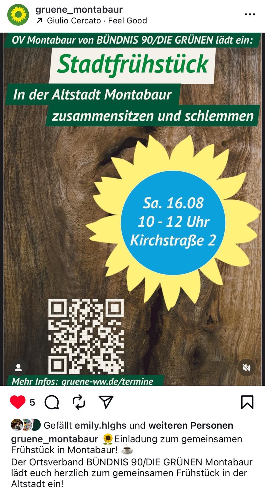 Der Ortsverband von BÜNDNIS 90/DIE GRÜNEN lädt alle Bürgerinnen und Bürger herzlich zu einem gemeinsamen Frühstück vor der Westerwald Bank ein. Diese Veranstaltung soll ein Zeichen der Gemeinschaft und des Austauschs setzen und bietet die Gelegenheit, in entspannter Atmosphäre ins Gespräch zu kommen.
