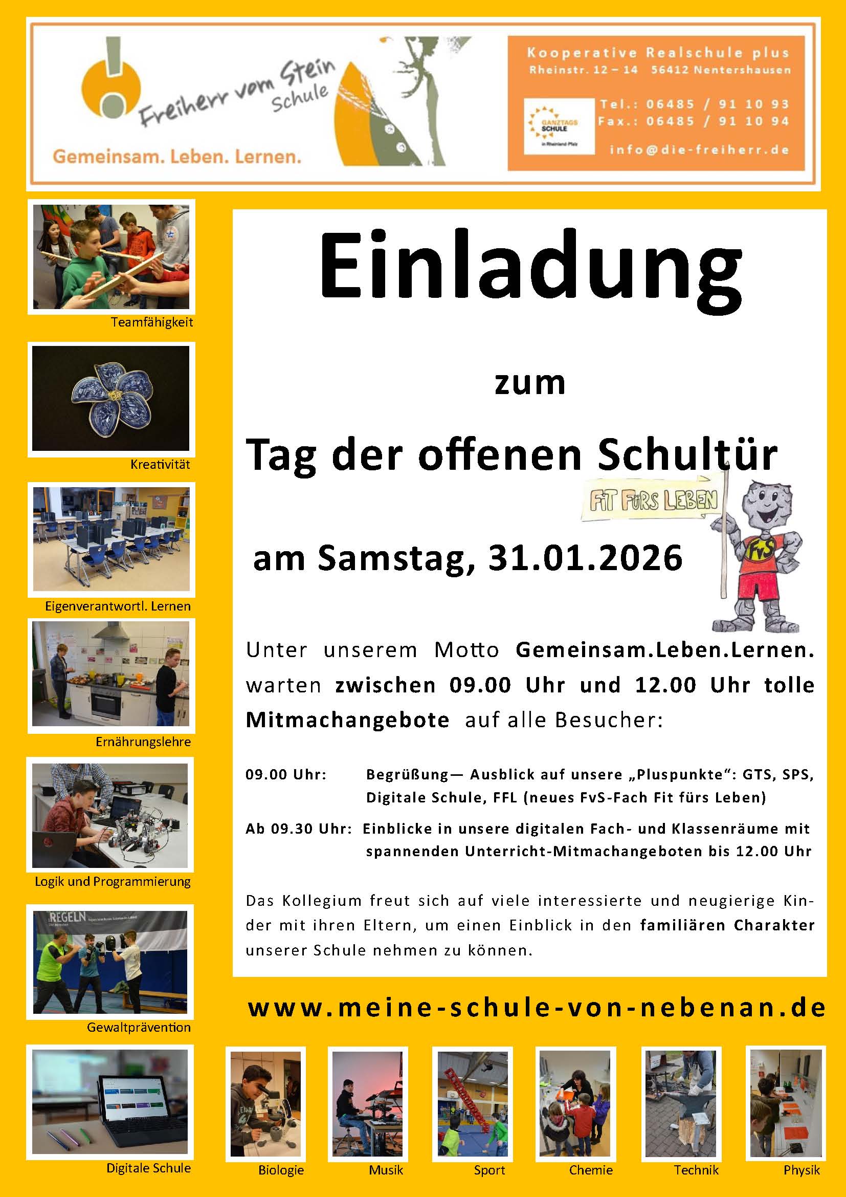 Tag der offenen Tür an der Freiherr-vom-Stein-Schule Rheinstraße 12-14 + Zu Google Kalender hinzufügen + iCal / Outlook exportieren 00 Tage 00 Stunden 00 Minuten 00 Sekunden Datum 31 Jan. 2026 Uhrzeit 09:00 Labels Nentershausen Standort Nentershausen Kategorie Wissen / Vortrag Teile diese Veranstaltung