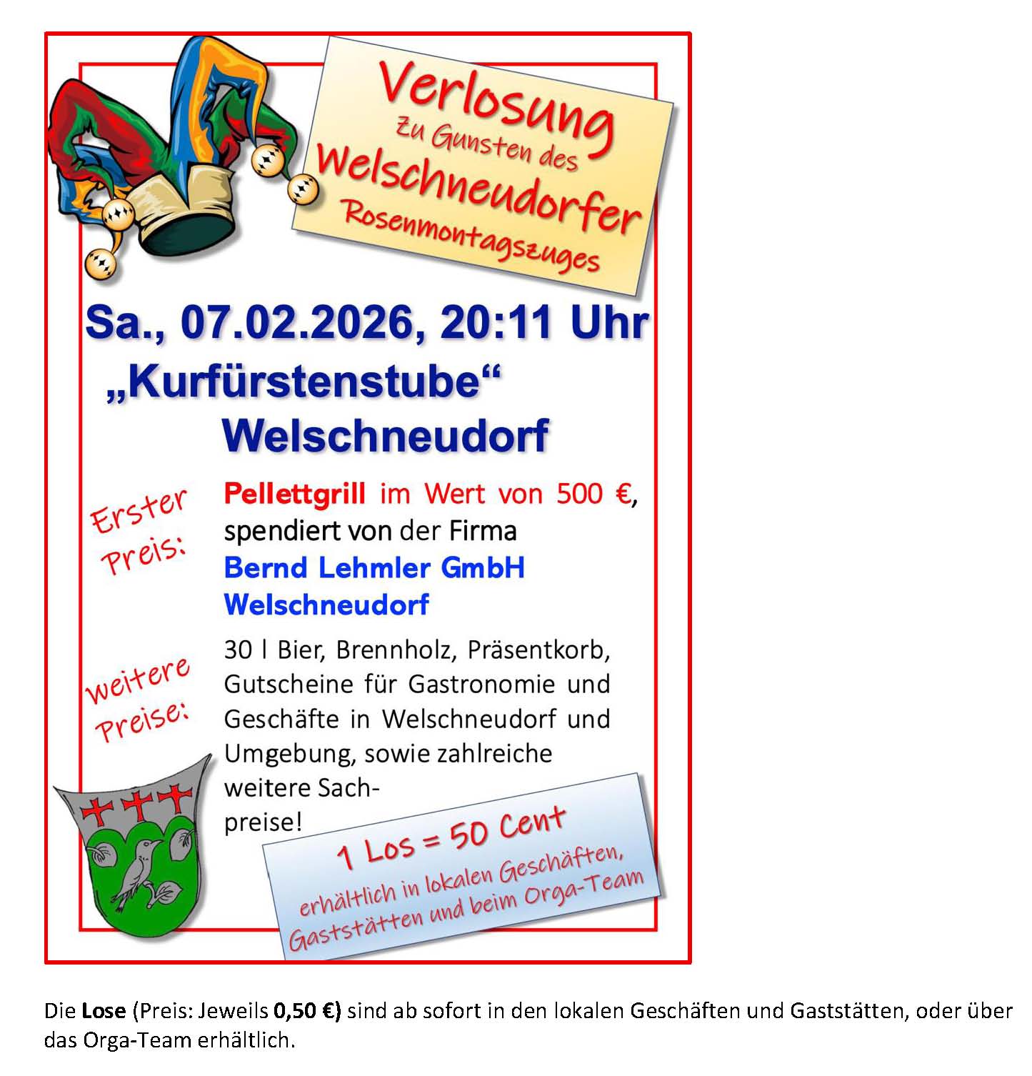 Verlosung zu Gunsten des Welschneudorfer Rosenmontagszuges Kurfürstenstube + Zu Google Kalender hinzufügen + iCal / Outlook exportieren 00 Tage 00 Stunden 00 Minuten 00 Sekunden Datum 07 Feb. 2026 Uhrzeit 20:10 Labels Welschneudorf Standort Welschneudorf Kategorie Feste / Brauchtum Teile diese Veranstaltung