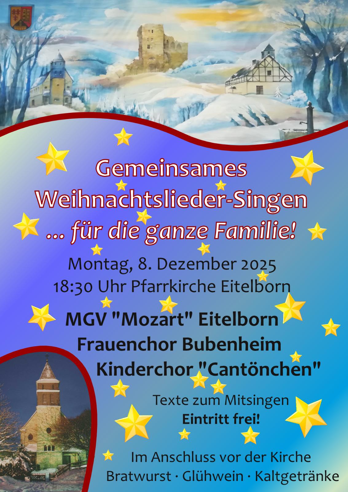 Weihnachtsliedersingen Pfarrkirche + Zu Google Kalender hinzufügen + iCal / Outlook exportieren 00 Tage 00 Stunden 00 Minuten 00 Sekunden Datum 08 Dez. 2025 Uhrzeit 18:30 Labels Eitelborn Standort Eitelborn Kategorie Feste / Brauchtum Kinder / Familie Musik / Konzerte Teile diese Veranstaltung